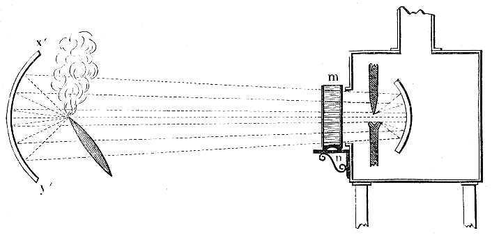 625. Vagy Végre a 105-ik ábrában mutatott berendezést fogadhatjuk el. A kamrában levő tükrön visszaverődött nyalábot egy második x'y' tükörrel fogatjuk fel, és szedetjük össze. A gyujtópontban, mely nehány lábnyira lehet a kamarától, ismét meglesznek a fentebbi eredmények. A sugarak fényét ott vágathatjuk el, hol legkényelmesebb; közönséges esetekben azonban czélszerűen cselekszünk, ha szénkéneg helyett kettős chlórszenet használunk és az átlátszatlan folyadékkal megtöltött mn edényt közel a kamrához helyezzük. Amint a széncsúcsok tüzesednek, a szerint a mint akarjuk, felrobbantást, elégést és kalorizálást észlelhetünk a gyujtópontban.