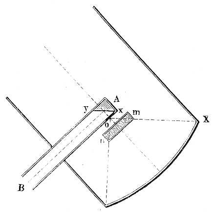 628. Ugyanez a tükör felállittatott Lubbock barátom (most Sir John Lubbock, Bart.) kertjében Chislehurst közelében, mert ott tisztább volt az ég. Négyzetes keresztmetszetü, feketített s az egyik végén nyitott óncső (106. ábra AB), a másik végén xy síktükörrel volt felszerelve, melynek fekvése 45 fokú szöget képezett a cső tengelyével. E csövön ki volt vágva körülbelül 2 négyzethüvelyknyi oldalnyilás (xo). E nyílást platinált platinalevél takarta be. Ha e levél a