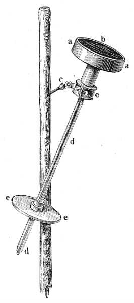 d hőmérő, melynek nyelét darab sárgarézcső védi. A hengernek lámpakorommal födött lapos végét a nap felé kell fordítani. A készülék cc csuklóval és csavarral rácsavarható valamely léczre, ezt pedig be lehet ütni földbe, vagy hóba, ha a megfigyelések jelentékeny magasságban történnek. A napsugarakat felfogó felületnek úgy kell állania, hogy a sugarak függőlegesen essenek reá. El lehet ezt érni ee korong segélyével, melynek épen akkora az átmérője mint az aczélhengeré s mely a hőmérőt védő sárgarézcsőre van erősítve. Ha a henger árnyéka födi e korongot, úgy biztosak lehetünk benne, hogy a sugarak függőlegesen esnek a henger fölfelé fordított lapjára.